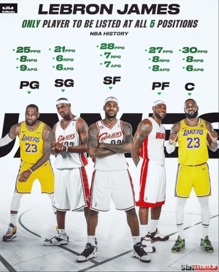 美媒晒出詹姆斯从1打到5的数据——PG场均25+8+9、SG场均21+6+6、SF场均28+7+7、PF场均27+8+8、C场均30+8+6,NBA历史上唯一一个真的从1打到5数据还如此炸裂的人只有他。
