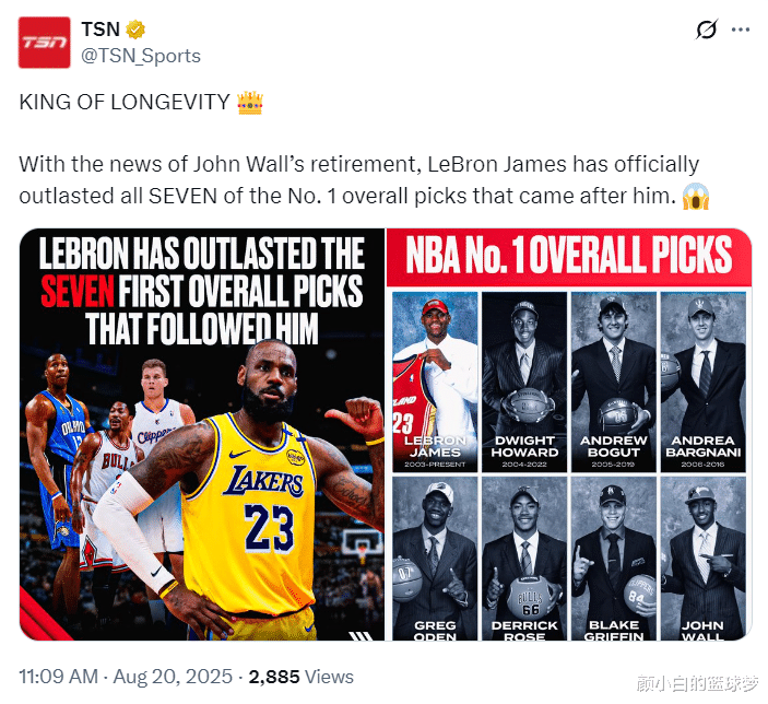 美媒TSN写道:勒布朗-詹姆斯又创造一项奇迹,他身后的7位状元都已经退役了,他下赛季还将继续在联盟打球!【早些时候约翰-沃尔官宣自己从篮球运动上退役】