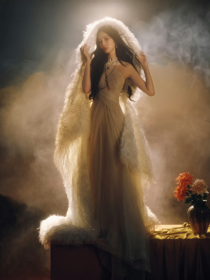 作为当晚红毯的“白月光”,这条连衣裙的设计堪称精准戳中审美点。来自奢侈品牌Giambattista Valli 2026早春系列的高定礼服,采用100%桑蚕丝面料,经过3次水洗打磨呈现出雾面柔光质感,挂颈设计巧妙露出天鹅颈与精致锁骨,领口处手工缝制的珍珠链暗藏小心机,随动作轻轻晃动更添灵动感。