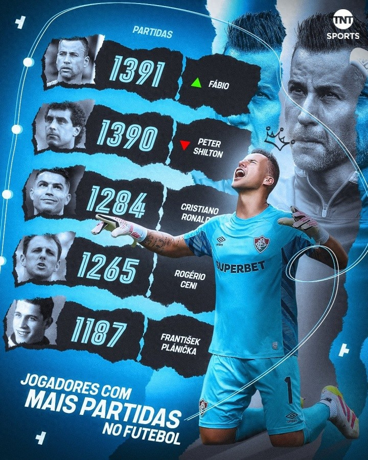 TNT Sports列足坛历史出场数前五,44岁巴西门将法比奥居首,40岁C罗排第三,目前落后107场,C罗是榜上唯一一名非门将球员。