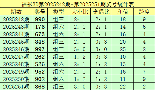 上期回顾:福彩3D第2025251期奖号:868。