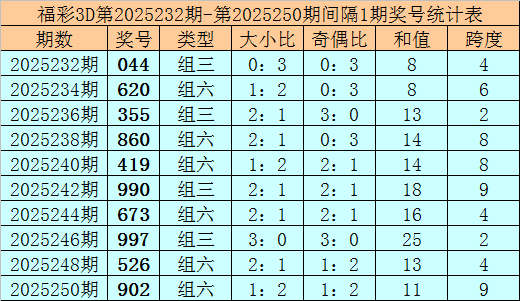 其中大小比3:0,奇偶比0:3,和值22,跨度2。