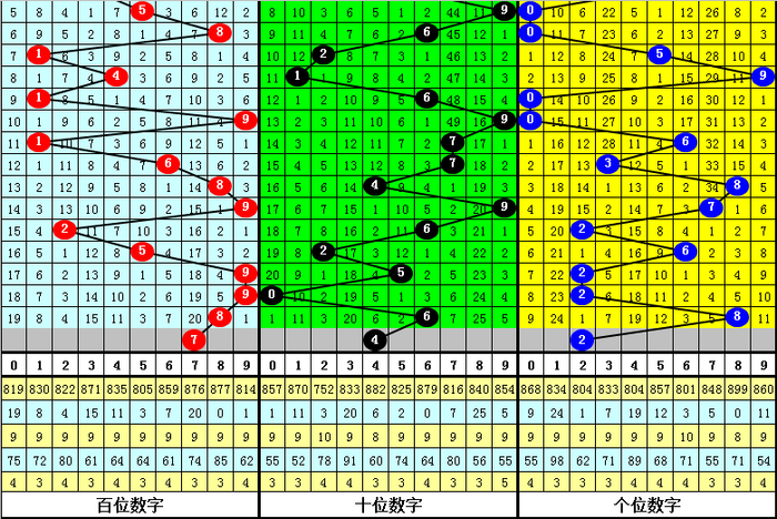 百位分析:上期百位开出奖号:8,最近9期该位奖号大小比为7:2,其中大号9出现3次,8出现2次,5、6出现1次,7出现0次,小 号1、2出现1次,0、3、4出现0次,本期百位参考大号,胆码关注7。