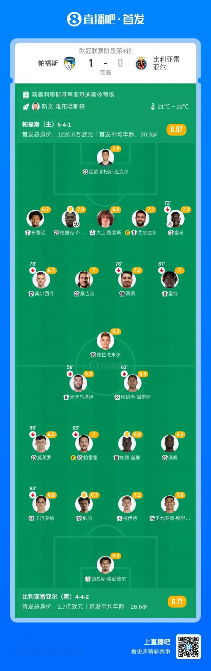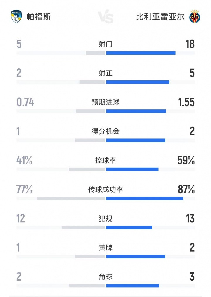 而无奈成为背景板的比利亚雷亚尔本场比赛在数据上占据绝对优势,几乎在所有的统计数据上都领先对手,但18脚射门、5次射正全都没能转化为进球,反倒被帕福斯利用角球机会破门。