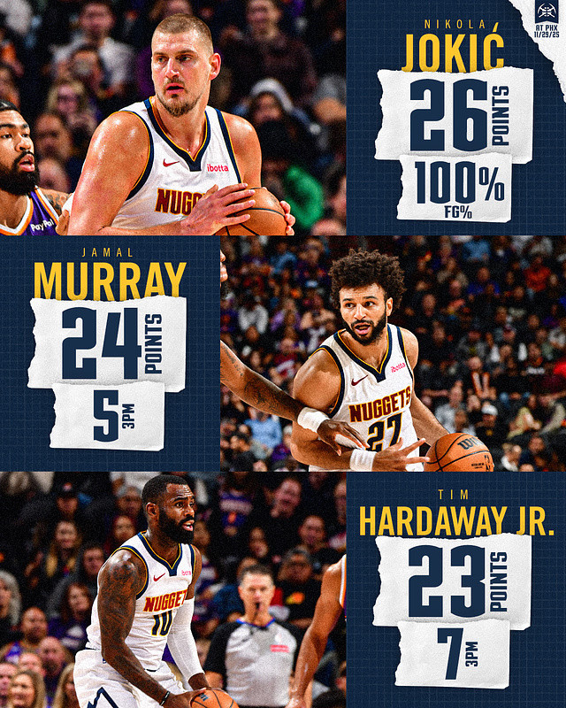 掘金今天有6人得分上双,其中三人得分20+。约基奇发挥出色,进攻端百发百中,效率极高,出战31分钟,投篮7中7,其中三分2中2,罚球11中10,得到26分9篮板10助攻的准三双,正负值+16。值得一提的是,约基奇过去两场比赛都只差一个篮板就拿到三双。