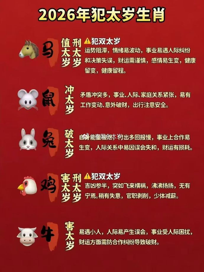 犯太岁并非绝对灾难,而是提醒人们审视自身、调整心态。现代人可将其视为一种心理暗示:当运势不顺时,积极应对往往能转危为安。接下来,我们逐一剖析2026年犯太岁的四大生肖及其具体影响。